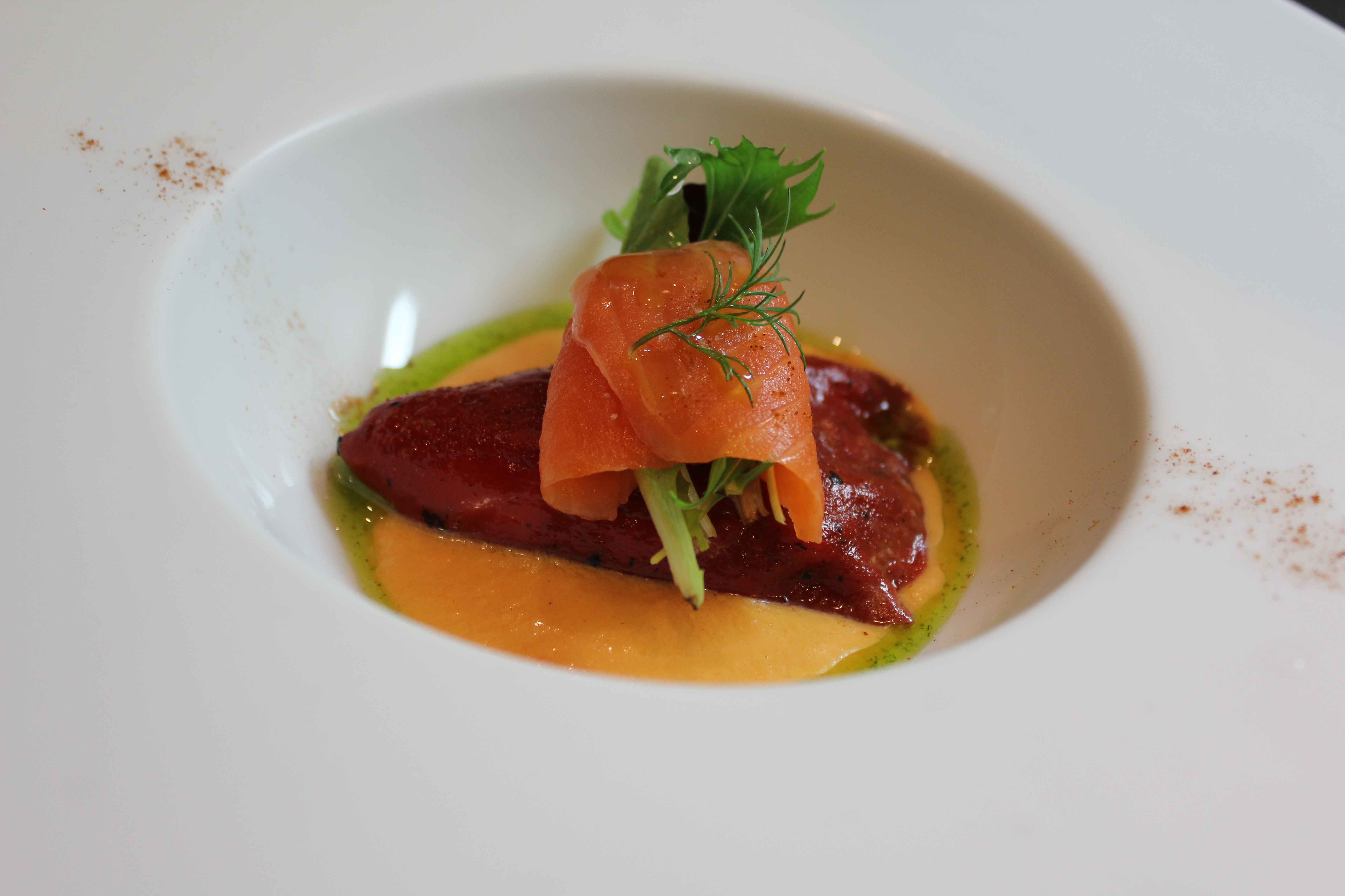 写真はサーモン等のタルタルをピキージョの中に詰めて、トマトの冷静スープ“サルモレホ”を添えたもの。ピキージョのひんやりとした程よい厚みの食感と、甘みやスモーク感がいい仕事をしています。